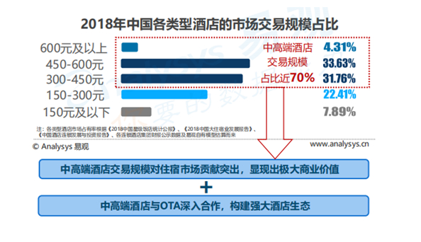 这种种因素,或许已经注定了在线住宿预订未来的市场格局。更细分来看,据《报告》显示,在2018年中国各类型酒店的市场交易规模占比的数据中,中高端酒店交易规模占据了将近70%,所以“得中高端酒店者得天下”的规则依然有效——这也再次解释了携程系在酒店领域交易额指数领先行业的现象。