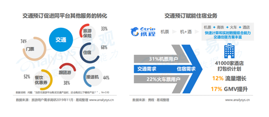 携程系在住宿市场的优势,和其“一站式旅游服务平台”的定位密不可分。Analysys易观分析认为,在线旅游产品消费过程中,机票/火车票等交通类产品是用户消费的主要类型,在线交通作为重要预订入口,对于酒店住宿、度假旅游等细分领域具有显著导流作用。携程的数据也印证了这一点:据其统计显示,其31%的机票用户有酒店入住需求,22%的火车票用户有酒店入住需求。