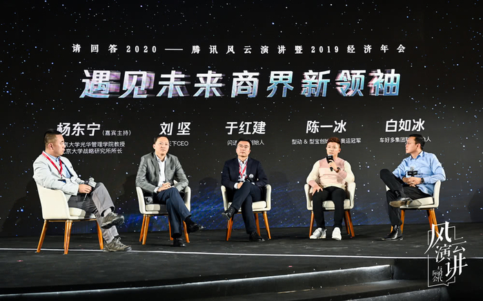 12月21日,在由腾讯新闻·原子智库主办、北京大学光华管理学院联合主办的“请回答2020:腾讯风云演讲暨2019经济年会”上,房天下CEO刘坚、闪送联合创始人于红建、车好多集团联合创始人白如冰以及型动&型宝创始人、奥运冠军陈一冰在“遇见未来商业领袖”对话环节,与北京大学光华管理学院教授、北京大学战略研究所所长杨东宁共同探讨商业领袖特质。
