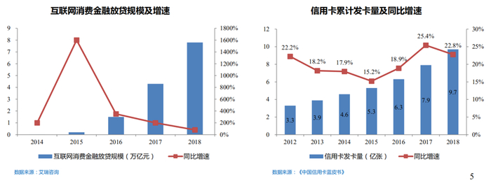 其中,互联网消费金融放贷规模持续增长,从2014年的0.02万亿元增长至2018年的7.8万亿元,增幅近400倍。信用卡发卡量与人均持卡量保持高速增长,创历史新高。2018年末信用卡发卡量达9.7亿张,同比增长22.8%;人均持卡0.7张,同比增长79.5%。