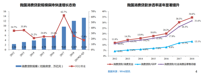 具体来看,截至2019年9月末消费贷款高达13.34万亿元,同比增长17.4%;消费金融渗透率由2016年的20.2%迅速提升至2018年的34.6%,逐步接近美国42%的消费金融渗透率水平。
