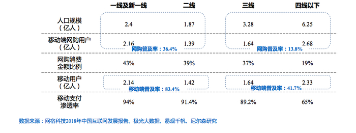 报告指出,从人口数量上来看,中国三四线及以下城市人口占比达到近七成,规模庞大。同时,目前低线城市的网购普及率及网购消费金额比率远小于一二线城市,线上业务市场挖据潜力大。