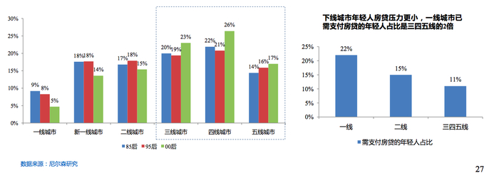 下线城市85后、90后、00后占比更高,1.2亿小镇青年群体,有56%每月可支配收入超过3000元,26%具备本科及以上学历,愿意尝试新品和愿意升级的占比分别为31%和55%,高于上线城市消费者的24%和53%。同时,下线城市年轻人房贷压力更小,信用消费意愿更强。