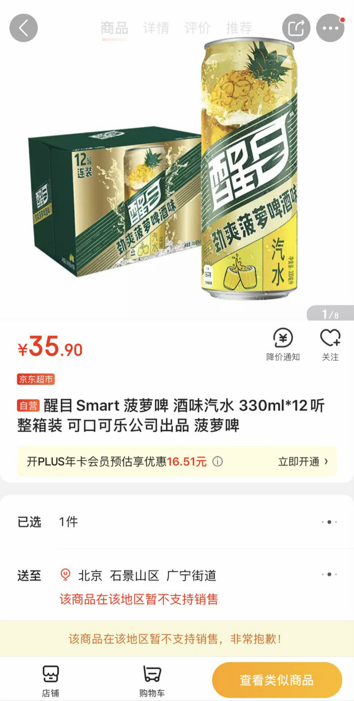 虽然再迎新品,但界面新闻搜索发现,在京东可口可乐自营店中,消费者只有选择河南省的收货地址,才能选购这款醒目菠萝啤;河南省外的消费者,只能去非自营店下单。
