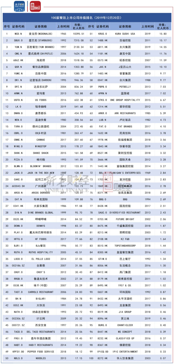 以新华财经和面包财经研究员列入研究样本的100家上市公司为例。这100家公司总市值(截至2019年12月20日)折合人民币约3.329万亿元。其中,两大餐饮巨头——麦当劳和星巴克,合计市值1.77万亿元,占比高达53.2%。