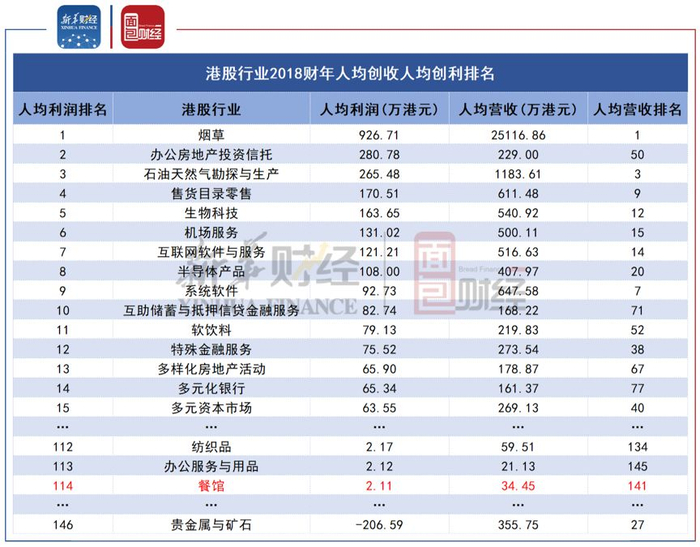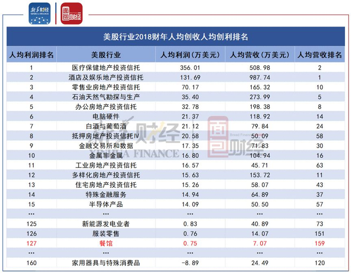 以Wind四级行业为口径梳理港股和美股2018财年不同行业的人均绩效情况发现,餐饮(餐馆)行业的人均营收和人均利润在众多行业中“垫底”。