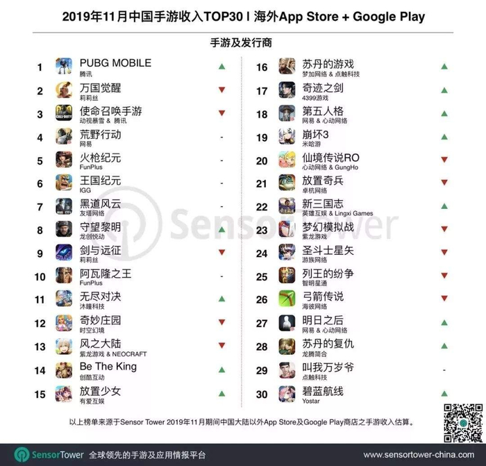 时至今日,《PUBG MOBILE》已经成了腾讯,甚至中国游戏在全球最大的爆款。据Sensor Tower统计,它仍旧是2019年11月中国海外收入最高的手游。