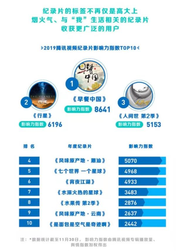 腾讯视频纪录片运营中心主编周茉指出,美食题材占据了腾讯视频纪录片的播放贡献半壁江山,说明在保持情感力度和内容深度的基础上,越是贴近人们生活的纪录片越能引起观众的共鸣。