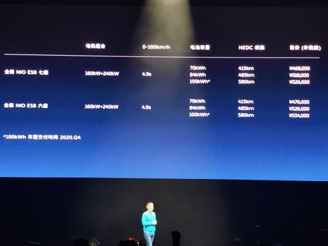 12月28日,在NIO Day 2019的发布会现场,蔚来全新ES8正式上市,售价为46.8-62.4万元,新车在外观、内饰、动力、续航、智能科技等多个方面共计188处进行了升级 和优化。新增100kWh液冷恒温电池包,最大续航里程成达到580公里。