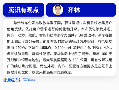 内饰方面,数字仪表盘由老款的8.8英寸升级为9.8英寸窄边高清屏幕,中控屏升级为11.8英寸窄边高清多点触控屏。方向盘按键升级为与ES6相同的NIO PLIOT按键,并增加了电动脚托,二排座椅电动调节等功能。新款车型还增加了全新解锁方式,全新NFC卡片式车钥匙,以卡片轻触车门感应处即可解锁车辆。