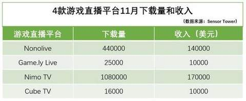 Nonolive 为 14 万美元,而 Game.ly Live 和 Cube TV 的 11 月全球总收入都不足 1 万美元。