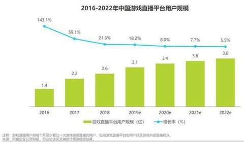 根据艾瑞咨询发布的《2019 年中国游戏直播行业研究报告》数据,从中国游戏直播平台的市场规模和用户规模的增长曲线来看,年增长率从 2017 年的 188.5% 放缓至 2022 年的 18.6%(预测数据),市场规模逐渐接近天花板。