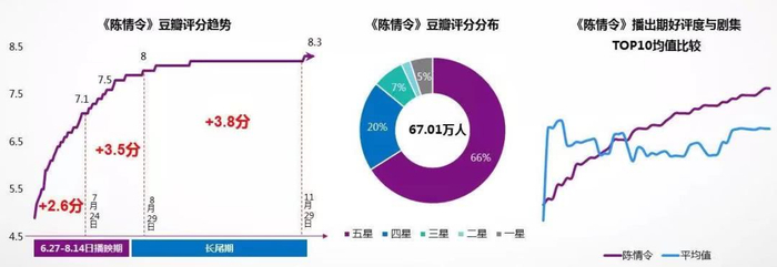 除了流量外,口碑同样是重点。2019年剧集市场已经实现从“量”到“质”的变化,流量万能的定律已经失效,能让观众买单的必然是精品内容。在2019年播映指数TOP 10网剧豆瓣评分榜中,腾讯视频的《陈情令》《全职高手》《庆余年》《致我们暖暖的小时光》《怒晴湘西》《我只喜欢你》六部作品评分超过7分。其中《陈情令》实现开分4.8到现在8.3的“逆袭”,一举成为2019年豆瓣评分最高的网剧。