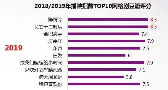 但可喜的是,数据显示,2019剧集质量水平有所提升。2019年TOP 30头部剧集豆瓣评分较去年有所提升,且台网各有爆款,以《都挺好》《陈情令》《全职高手》为代表的剧集口碑热度双丰收。