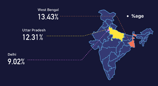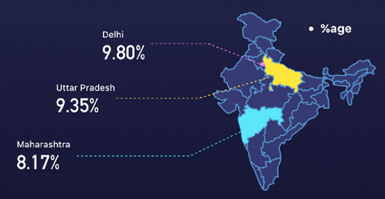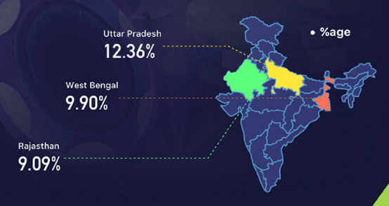 报告指出,大多数 Rummy 玩家来自北方邦(Uttar Pradesh),占用户总数的 12.36%。西孟加拉邦(West Bengal)和拉贾斯坦邦(Rajasthan)的用户数分别占用户总数的 9.9% 和 9.09%。