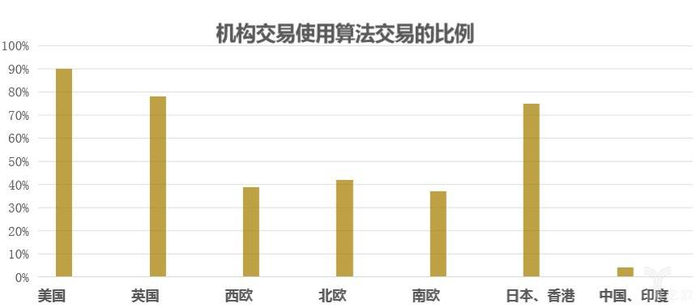 国外算法交易服务主要以投行、券商自研为主,提供给专业的机构客户使用,同样也有一些三方的企业为客户提供服务,在欧美一些成熟的市场,机构使用算法交易的占比较大;而国内市场尚处于逐步成熟阶段,占比较低。