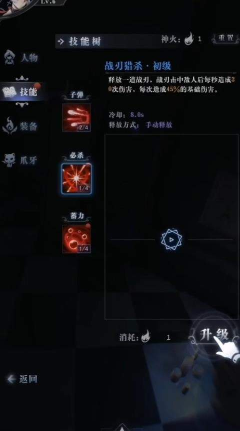 其次,每位角色有三个技能,分别是:“子弹技”“必杀技”“蓄力技”。其中必杀技是需要玩家来点击释放,其余技能全部自动释放。每个技能都可升级来强化伤害或者效果,比如子弹技可以强化普通攻击的子弹,蓄力技升级则可强化伤害。