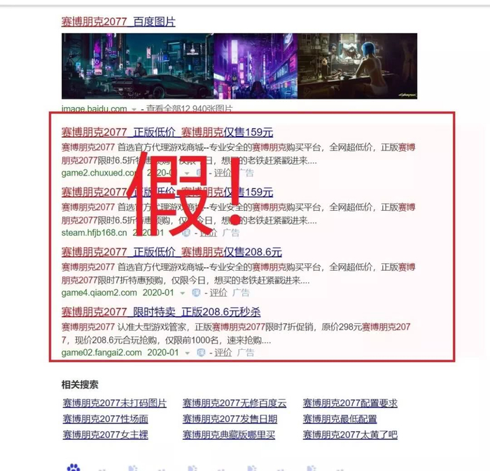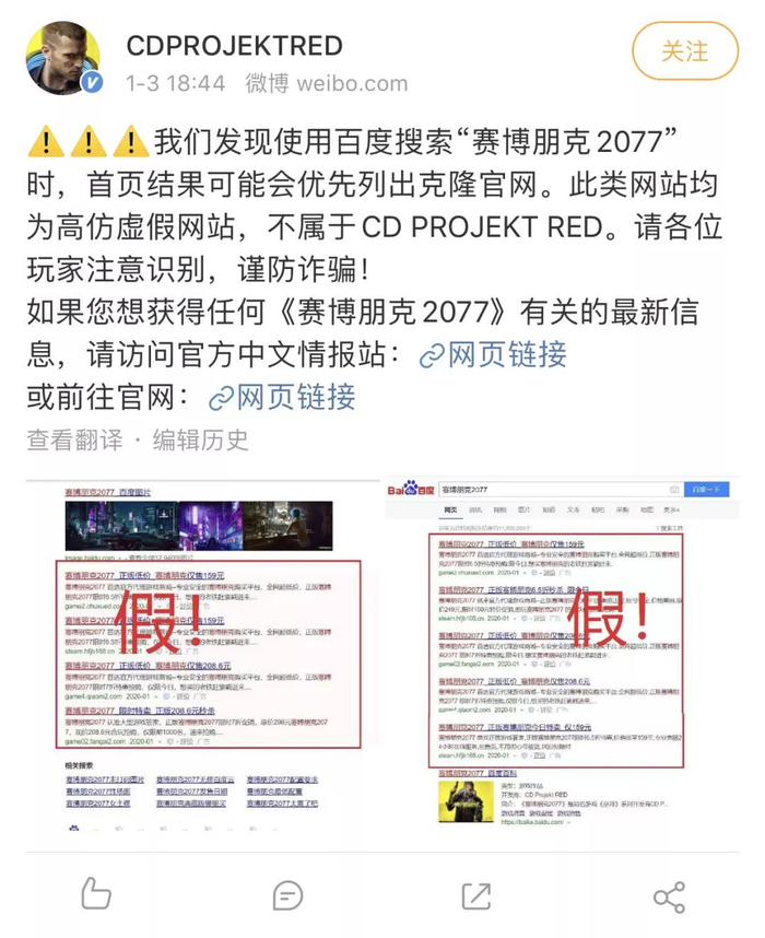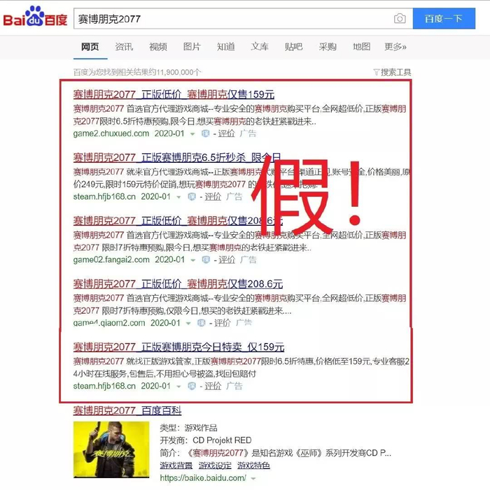 CD PROJEKT RED官方表示,发现搜索“赛博朋克2077”时,搜索首页结果可能会优先列出克隆官网。
