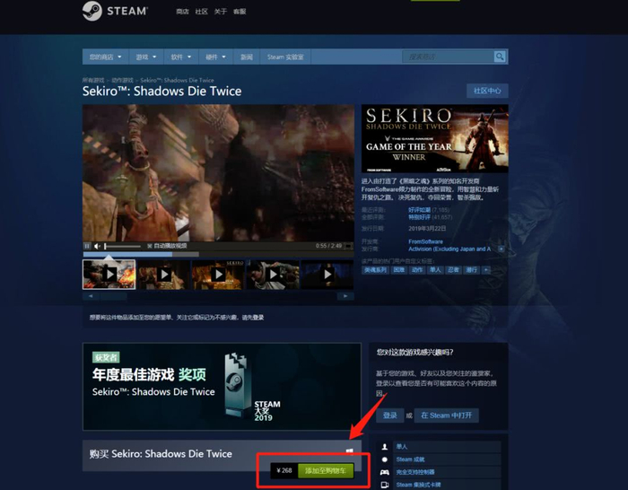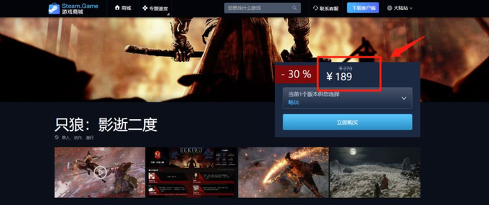接下来我们再来看一下正版与高仿的价格差异,在正版Steam官网上,《只狼:影逝二度》目前的售价为268元:
