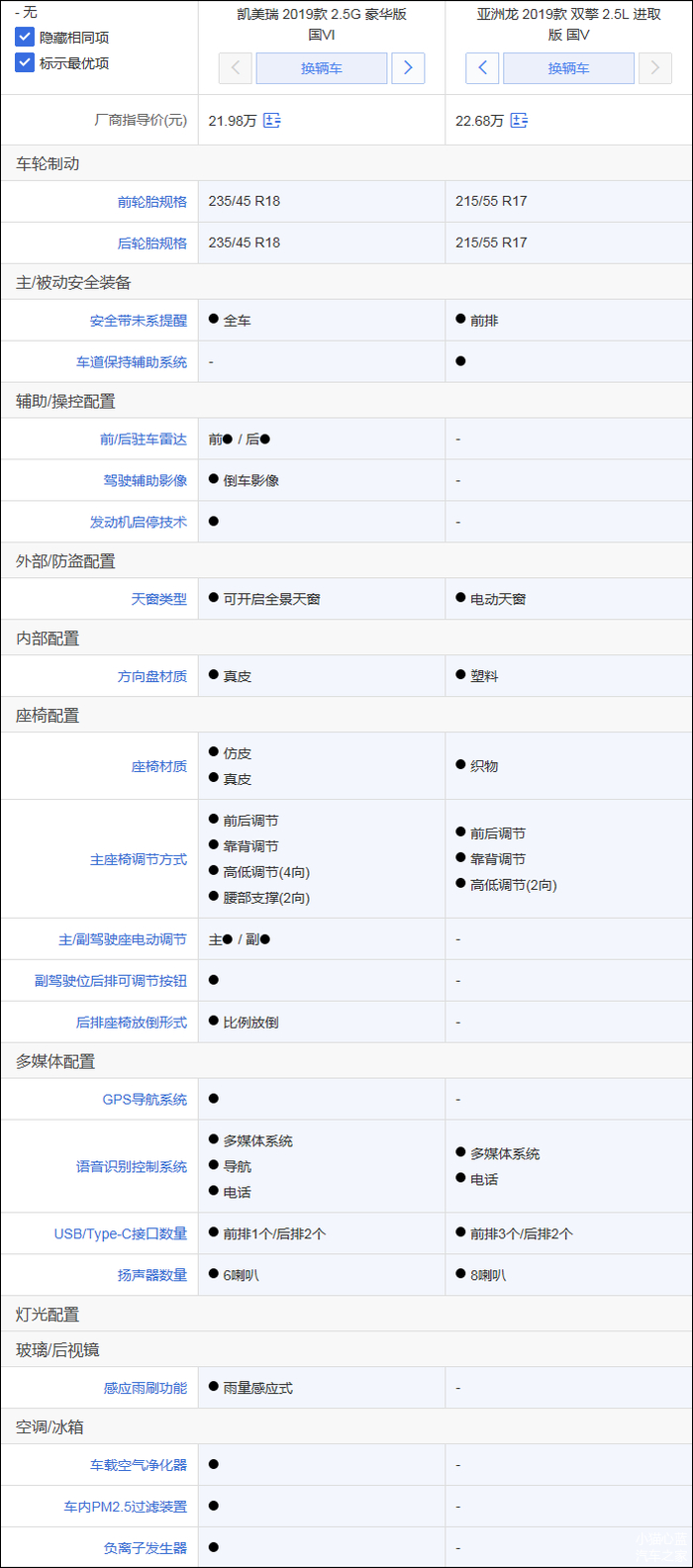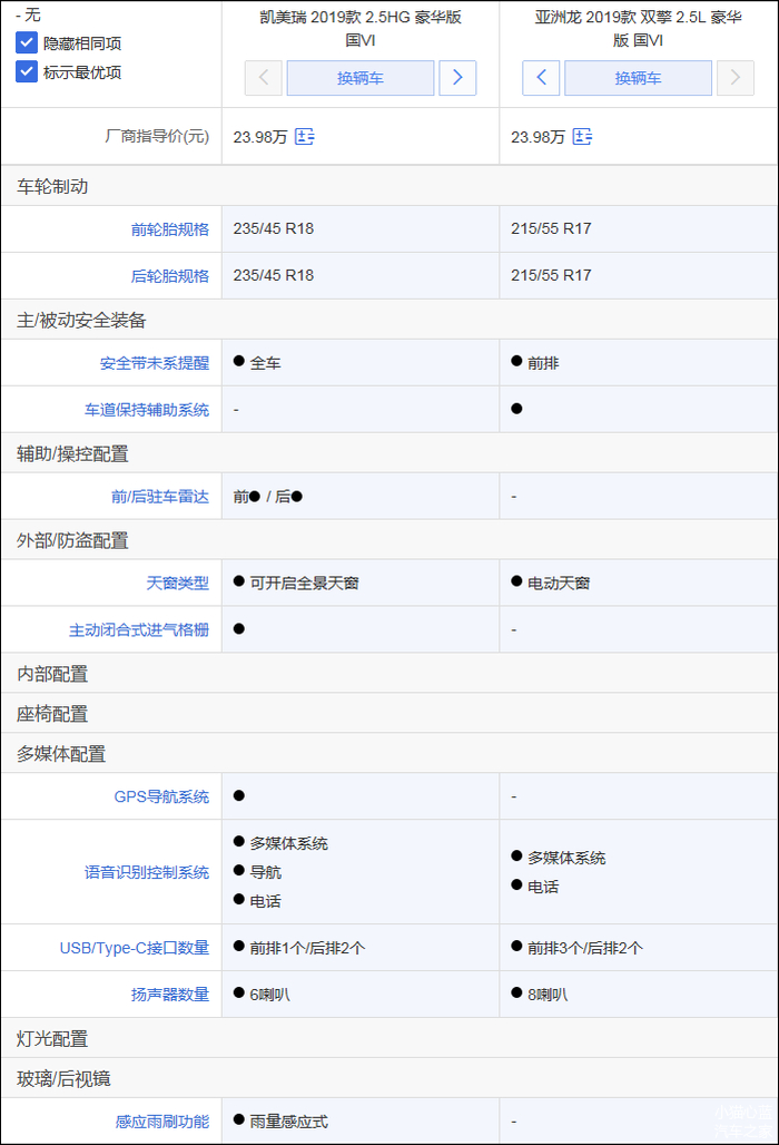 这是主销混动车型的对决,在价格相同的情况下,两款车取舍有所不同,凯美瑞的优势是多出前/后驻车雷达、全景天窗、GPS导航系统、雨量感应式雨刷等;亚洲龙的优势是多出车道保持辅助系统系统,是选择舒适性配置多一点还是主动安全配置多一点,这由您的需求决定,小猫认为车道保持辅助系统系统的诱惑力要大于全景天窗、雨量感应式雨刷等。