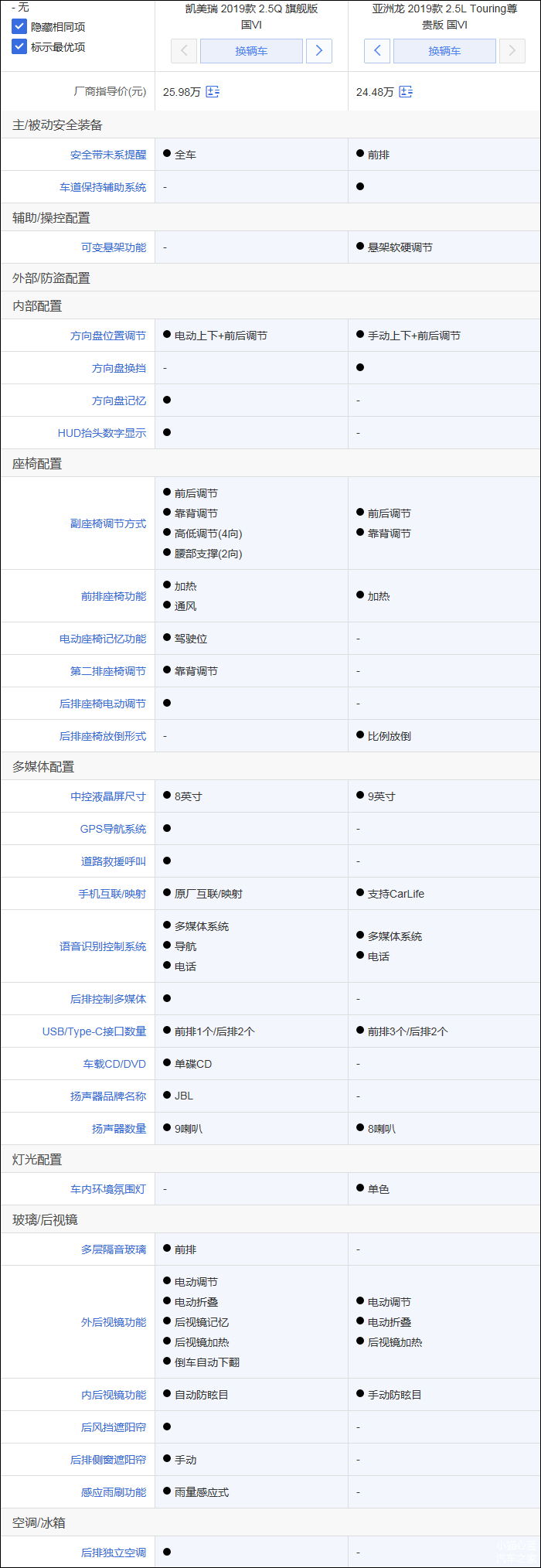 凯美瑞配置方面,凯美瑞的优势是多出前/后驻车雷达、倒车影像、全景天窗、皮质座椅/方向盘、主/副驾驶座电动调节、副驾驶位后排可调节按钮、GPS导航系统、雨量感应式雨刷、车载空气净化器等,亚洲龙的优势是多出车道保持辅助系统;在舒适性配置方面,凯美瑞具有一定优势,但亚洲龙在主动安全性方面略胜一筹且采用混动系统,如果您不是非常抵触购买后自行加装倒车雷达或倒车影像,小猫认为亚洲龙在性价比方面更有优势。