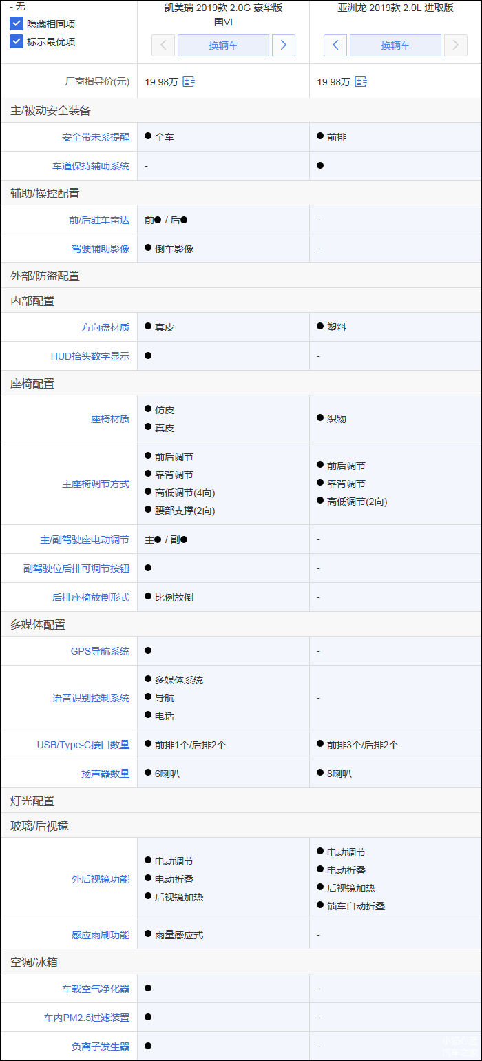 亚洲龙配置差异方面,亚洲龙的优势是多出车道保持辅助系统、外后视镜锁车自动折叠等,凯美瑞的优势是多出前/后驻车雷达、倒车影像、HUD抬头数字显示、皮质座椅/方向盘、主/副驾驶座电动调节、副驾驶位后排可调节按钮、语音识别控制系统、GPS导航系统、雨量感应式雨刷、车载空气净化器等;就性价比而言,凯美瑞要更胜一筹,考虑到两款车在空间方面旗鼓相当,小猫建议预算在20万元以内的消费者选择凯美瑞2.0G豪华版。