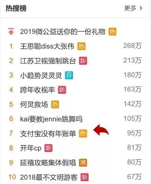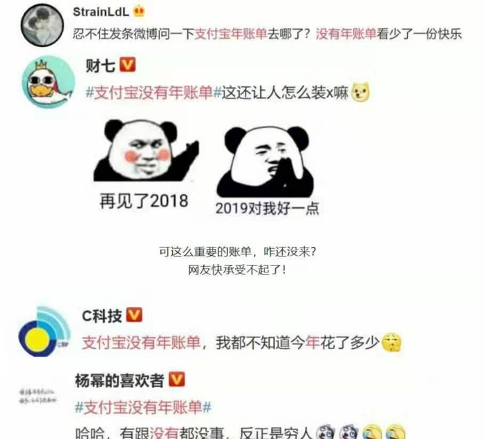 2019年1月1日开始,“支付宝没有年账单”就一直霸占着微博的热搜榜单,无数网友在其下面纷纷哀嚎: