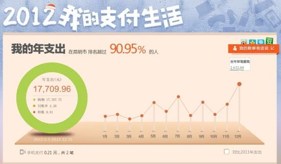 “那一天升级完支付宝,就收到了一份“年度对账单”,不看不知道,一看真的太厉害了,这份账单详细的记录了自己在过去一年都把钱花在那些地方了,真的是一目了然”他曾对媒体这样表示。