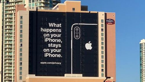 虽然不参会,但苹果却在去年CES展外大楼上竖起了一块巨大的招牌,宣传其设备的安全隐私特性。