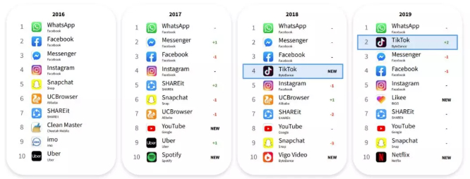 在全球范围内,TikTok在2019年的排名仅次于Facebook的WhatsApp。与2018年相比,其超越Messenger和Facebook又上升了两名。