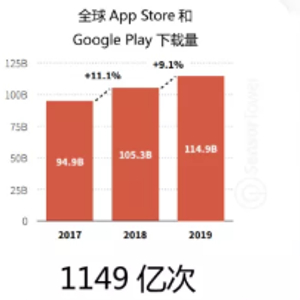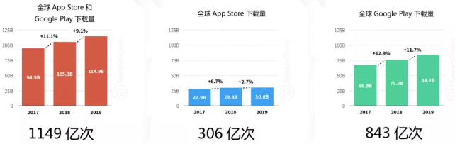 在Sensor Tower最新的2019年Q4报告中,其为2019年整年进行了数据分析和事记报告。2019年,全球移动市场下载量规模同比2018年提高了9.1%, App Store和Google Play总下载量达1149亿次,其中App Store总下载量达306亿次,同比涨幅2.7%,Google Play总下载量达843亿次,同比涨幅11.7%。