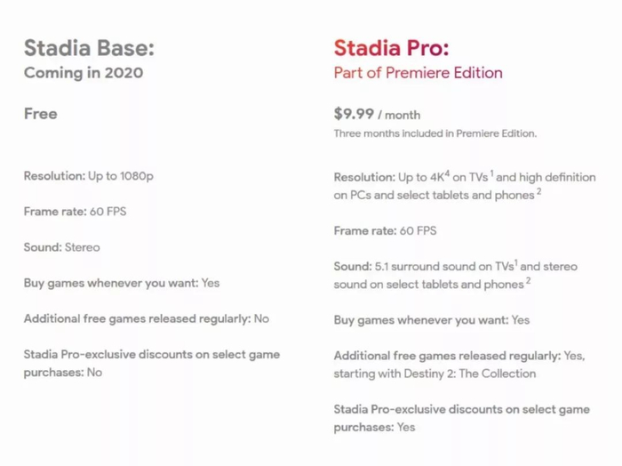 2019年11月19日,谷歌正式宣布Stadia上线运行。Stadia的收费模式是类似于Netflix的订阅制,不同的是,订阅用户还需要额外购买游戏才能体验。Stadia分为免费版与Pro版。免费版可以免费享受1080P画质、60帧和立体声的云游戏服务;Pro版每个月需要9.99美元的订阅费,可以在全平台达到4K画质、60帧以及5.1环绕声与移动设备立体声,并定期赠送免费游戏与折扣券。