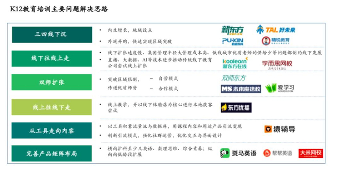 新东方企业发展与战略规划部投资总监柳倩提到,报告中总结了K12教育培训领域中的六种破局思路,分别为三四线下沉、线上往线上走、双师扩张、线上往线下走、从工具走向内容和完善产品矩阵布局等方向。