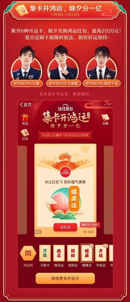 在“新年心愿”中,用户可以向邓伦、杨紫、张艺兴等金牌心愿官许愿,有机会得到心愿官的亲自翻牌,并被助力达成心愿。该活动上线当天参与网友就快速突破了百万。“新年开运卡”1月9日上线,参与该活动的用户可以通过每日签到,刷微博、看视频等方式集卡。微博还联动了其新款APP“绿洲”,发布绿洲可获得万能卡。在集齐 “健康运”、“平安运”、“招财运”、“高升运”、“桃花运”以及“开挂运”这6种开运卡或集齐5种卡片+万能卡,在除夕当天18:00前合成鸿运红包,即可参与瓜分一亿元,最高可获得2020元。在此活动中还开发了明星定制卡面,在小年、除夕等节日点,微博会邀请多位人气明星送卡帮助用户集齐。最后“新春锦鲤季”中,一些明星、大V、企业等会发布带有话题#新春锦鲤季#的锦鲤微博,转发即可参与抽奖,奖品涵盖千元红包、游戏稀有装备、国潮礼包等等。