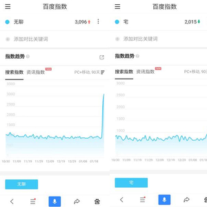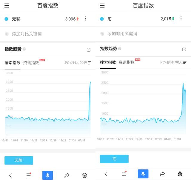 受武汉新型冠状病毒肺炎疫情的影响,今年春节国民聚会需求大大减少,更有众多民众春节不回家,绝大多数人选择“宅”在自己的“窝”里。百度指数显示,“无聊”、“无聊的时候干什么”、“宅”等关键词热度均大幅提升,很多类似搜索指数甚至短期创新高,看得出大家为了对抗疫情,真的“付出了很多”。