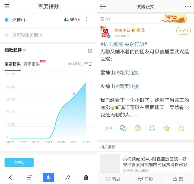 虽然足不出户,但疫情的蔓延依然牵动着国民的心。无论是感染人数的每一次变化,还是广大医务人员在疫情防治中所取得的每一次胜利,都让网友倍加关注。针对疫区持续建设中的武汉火神山和雷神山医院,不少关心疫情的网民和亲友观看线上直播,每天百万国民在线打卡,乐观网友纷纷在线版聊,调侃“赶来监工”,与“火神山”相关的百度指数关键词热度,也在网友的关注下呈爆发式增长。