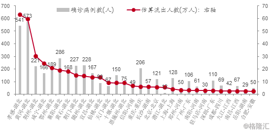 该图表是根据2020年1月1日-1月27日武汉流出500万人进行估算的,例如,武汉流向孝感的人数最多,为63万人,确诊病例数量为541人;黄冈第二,为60万人,确诊病例数量为573人。