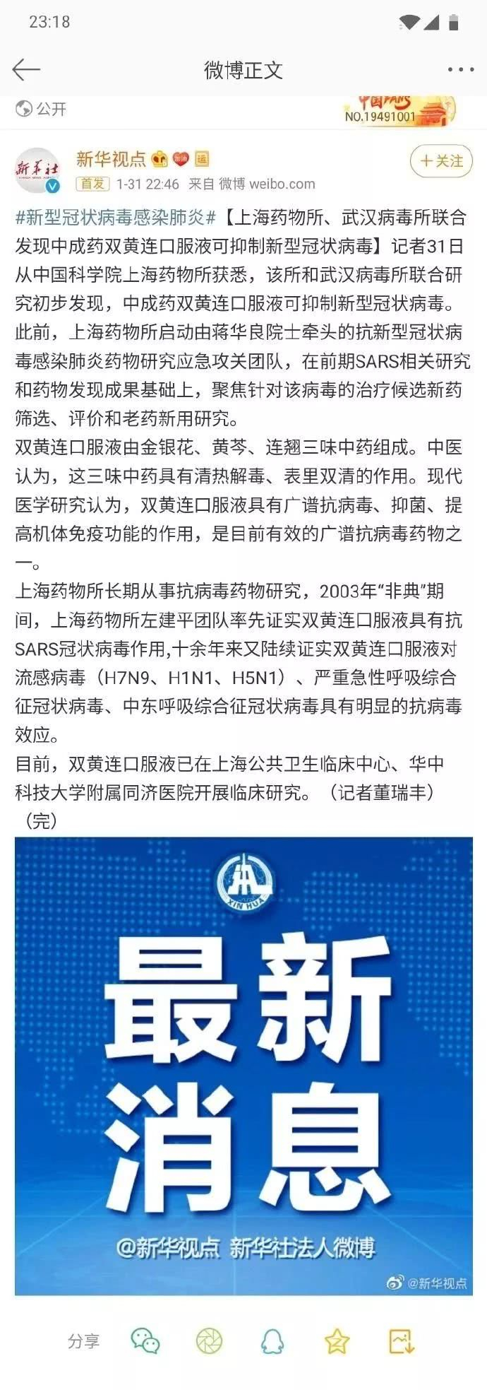 1月31日晚间,新华社法人微博@新华视点发布了一条微博,称上海药物所、武汉病毒所联合发现中成药双黄连口服液可抑制新型冠状病毒。该微博称:“记者从中国科学院上海药物所获悉,该所和武汉病毒所联合研究初步发现,中成药双黄连口服液可抑制新型冠状病毒。”