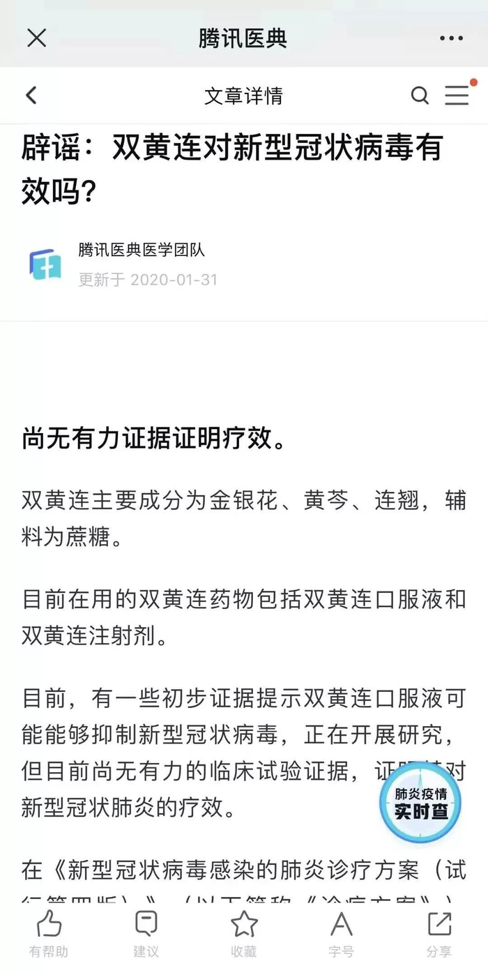 率先发布“辟谣”信息的是腾讯医典医学团队,其第一时间对该消息表示“存疑”,称:“尚无有力证据证明疗效。”在现有公开的研究信息中,双黄连颗粒、双狂狼口服液等药品显示对多种流感病毒有效,但其中并不包括对冠状病毒有效性的数据。
