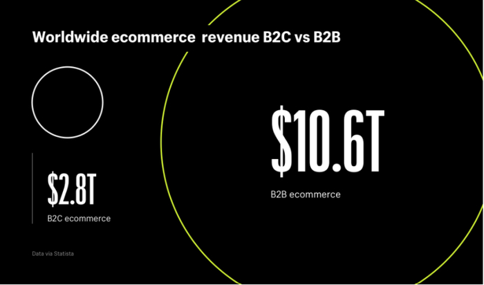 说到跨境电商,淘宝、亚马逊等平台 B2C 业务的迅速膨胀有目共睹,而 B2B 电商市场的交易规模实际上更大。据 Statista 发布的《2019 年 B2B 电商》报告显示,2019 年全球 B2B 电商收入为 B2C 的近四倍。