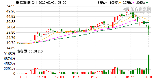 受消息影响,上周五(2月1日)瑞幸咖啡盘中一度暴跌逾26%,截至当日收盘股价下挫10.74%。