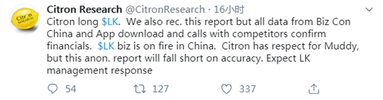 距浑水发布推特之后仅两小时,知名做空机构香橼Citron Research也发推文,表示看多瑞幸。