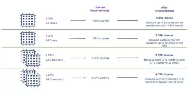 VMware新的许可费:一块CPU中核心数量超过32个,需要支付两倍的费用