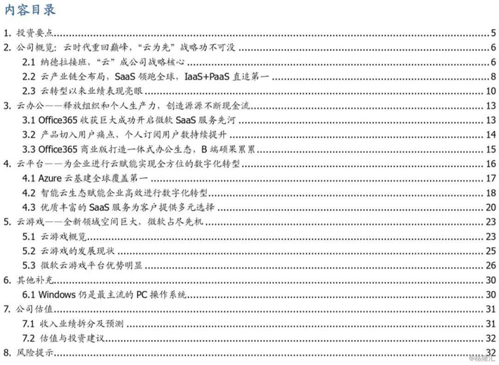 (1)公司近年以云为核心的转型十分成功,我们认为公司以Office365为主的云办公业务还将延续当前良好的发展趋势,而随着全球数字化进程不断深入,公司toB端业务将进一步高速拓展。随着云游戏的推进和落地,公司游戏业务有望实现新的突破。