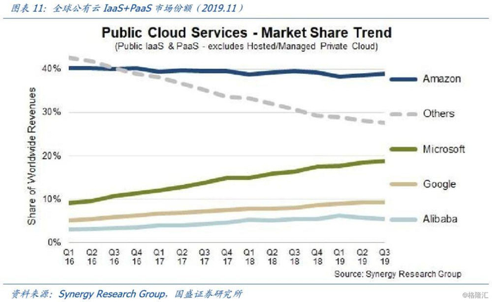 IaaS+PaaS直追第一。根据Synergy Reserve最新数据显示,2019Q3在全球公有云服务市场中,微软市场份额从2016Q1的不到9%上升到19%,而领头羊亚马逊市占率则略微有所下降,在整体IaaS+PaaS市场总量不断扩大的同时,微软实现了市占率的不断提升,充分体现了微软在IaaS+PaaS领域不断扩张的目标和实力。