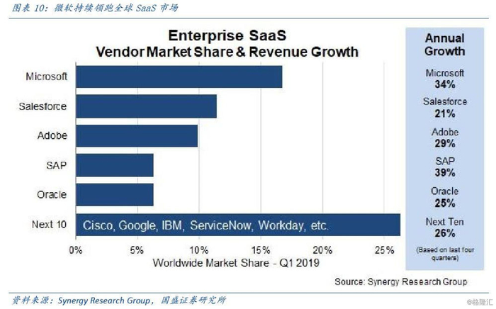 SaaS业务优势明显,全球范围内市场占有率持续保持第一。微软以Windows和Office起家,公司具备非常强的软件服务能力,在SaaS业务上优势十分明显。微软企业级SaaS服务主要以Office 365、Dynamics 365及LinkedIn为核心,同时将SaaS平台向开发者开放丰富产品的功能,使产品更具活力。根据Synergy Research的数据,2019年Q1微 软以17%的份额占据全球SaaS市场首位,较上一季度增长34%,领先优势继续扩大。