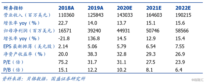我们认为公司经营情况良好,公司产品市场地位高,议价能力强附加值高,预计公司未来利润率水平在保持现有基础上或还有一定的提升空间。我们预计2020-2022年公司综合毛利率为67%/67%/67%。基于以上假设,我们预测公司2020-2022年归母净利润分别为449.31/507.46/585.66亿美元,同比增长14.5%/12.9%/15.4%,对应EPS分别为5.79/6.54/7.55。