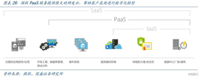 云产业链全布局,微软提供全方位云解决方案。微软的云计算布局覆盖了IaaS-PaaS-SaaS在内的全产业链,在全球范围内是唯一能够提供三种云服务模式的厂商。微软在SaaS领域长期领跑全球,且有持续扩大优势的趋势。在重资本的IaaS+PaaS领域,微软保持在全球第二名且市占率还在不断提高,大有和AWS一争高下的趋势。微软在整个云产业链的全方位布局,使得其拥有在全球范围内为用户提供云解决方案的能力,让微软的云服务成为用户的不二自选。