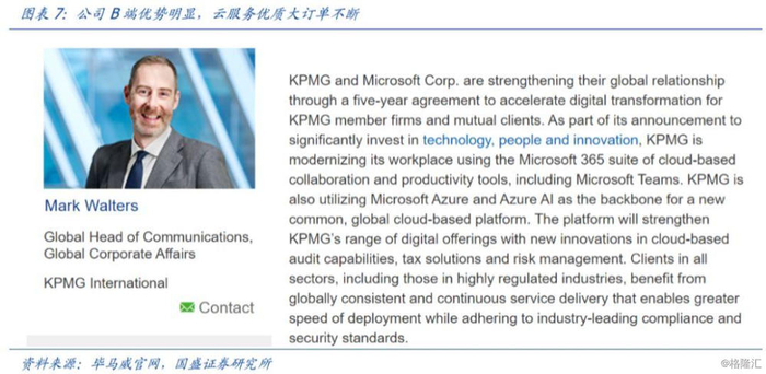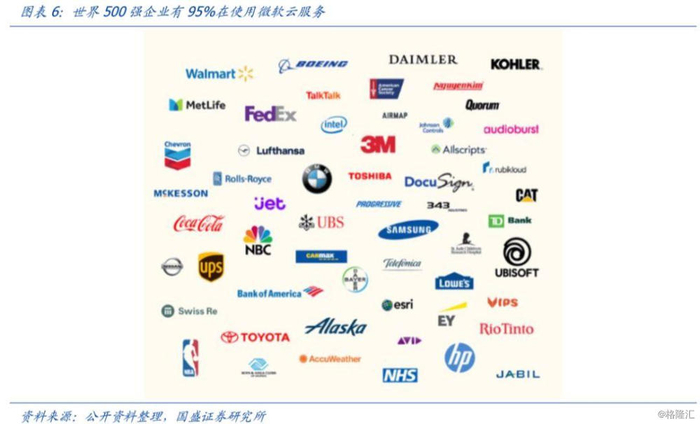 公司企业级客户资源丰富,云产品切入客户数字化转型痛点。公司拥有庞大的企业客户基础和良好的口碑,具有出色的B端业务基因。公司云产品切入到企业级客户的痛点,为客户进行数字化转型赋能,有相关需求的客户基于先前良好的合作基础,更愿意尝试使用公司的产品,公司在B端业务上具有先天优势。根据统计,世界500强企业有95%在使用微软云服务,在B端市场公司具有很高的认可度。