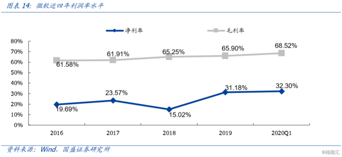 利润水平不断提高,凸显公司产品内在价值高。公司近年来经营状况良好,毛利率水平稳定提高,整个2019财年毛利率达到65.9%,2020财年Q1毛利率提升至68.5%。公司净利率表现出色,2018财年利润水平大幅下滑主要是受税改与就业法案影响,公司在二季度计提了138亿美元一次性费用所致,公司的净利率稳定提升,在2019财年净利率达到31.18%,盈利能力十分出色。